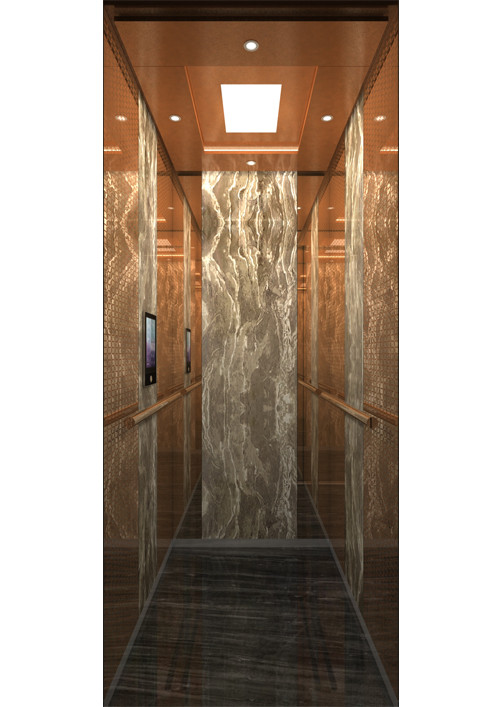 天井:噴砂不銹鋼  后側(cè):彩紋鋼板浮雕木紋+鏡面不銹鋼  左右:彩紋鋼板浮雕木紋+彩紋鋼板大理石紋+鏡面飾條  前側(cè)+轎門:香檳金鏡面  地板:PVC大理石紋